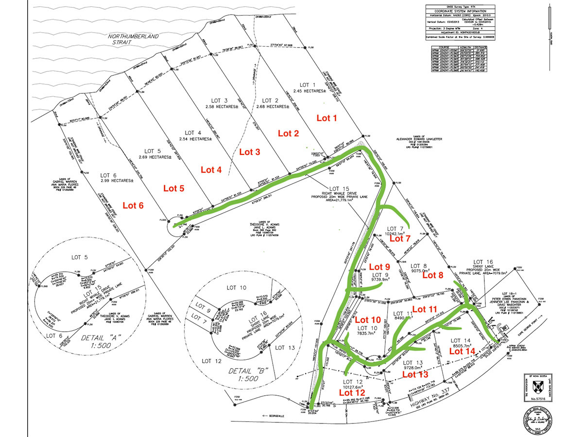 Property sizes vary between 2.2 to 7.1 acres with 239 to 311 ft. of oceanfront with panoramic views overlooking the popular Northumberland Strait. Water view lots are nestled along a gently sloping hill with magnificent views and colorful sunsets. All lots are approved for single residential homes and cottages. Some protective covenants apply in order to maintain the positive character of this development.