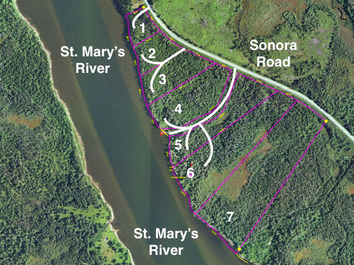 Property sizes vary beween 1.4 to 12.7 acres with 256 to 490 ft of waterfront. Lots 4 to 7 slope gently to the water while lots 1 to 3 sit higher above. A private wharf could easily be installed in front of each property. Each property offers at least one unique building site with astonishing views over the river. All lots are approved for single residential homes and cottages. Some protective covenants apply in order to maintain the positive character of this development.